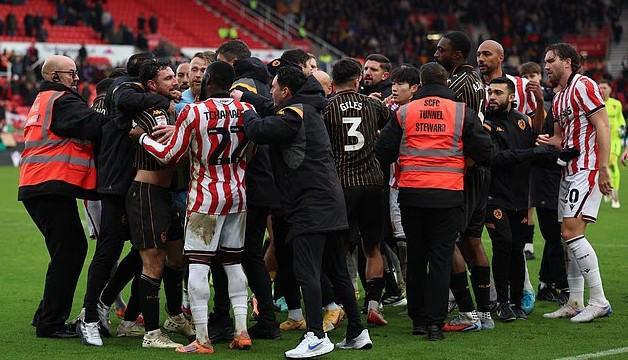 据《每日邮报》报道,斯托克城与赫尔城的英冠比赛在最后时刻的制胜球后陷入混乱,比赛以双方球员在场上的斗殴结束,冲突由赫尔城队在绝杀后进行的庆祝动作引发。